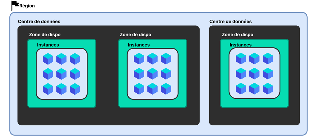* **Zones de disponibilité** : ensemble de composants d'infrastructure dédiés dans un centre de données