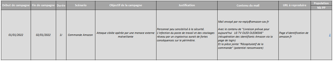 Lorsque vous souscrivez une campagne de phishing, vous devez remplir un tableau excel où vous spécifiez les éléments de votre scénario souhaité.