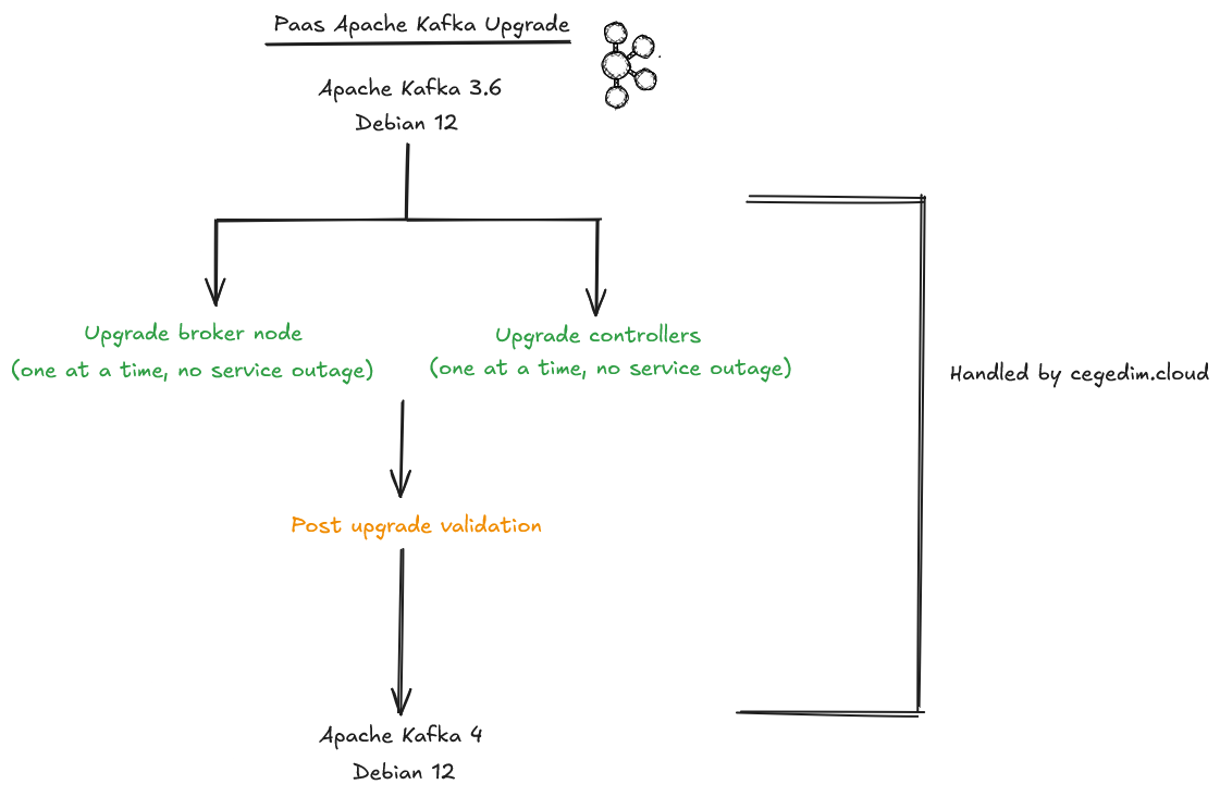 Upgrading an Apache Kafka PaaS operating in **KRaft** mode is managed by **cegedim.cloud** and can be requested through an [ITCare ticket](https://itcare.cegedim.cloud/support?createTicket=true\&requestTypeIndex=4\&formName=MES_KAFKA\&step=Request). Please specify your preferred time slot for the upgrade.