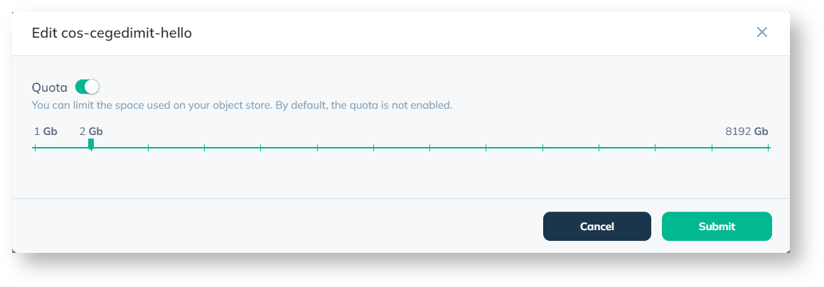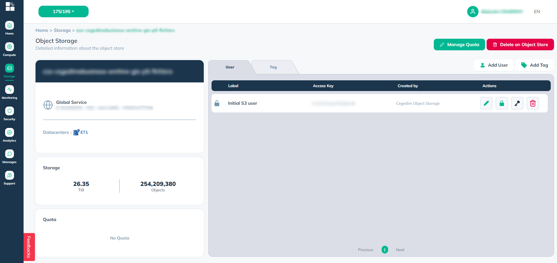 To manage **Quota**, go the detailed information page of your Object Store and click on the **Manage quota** button.