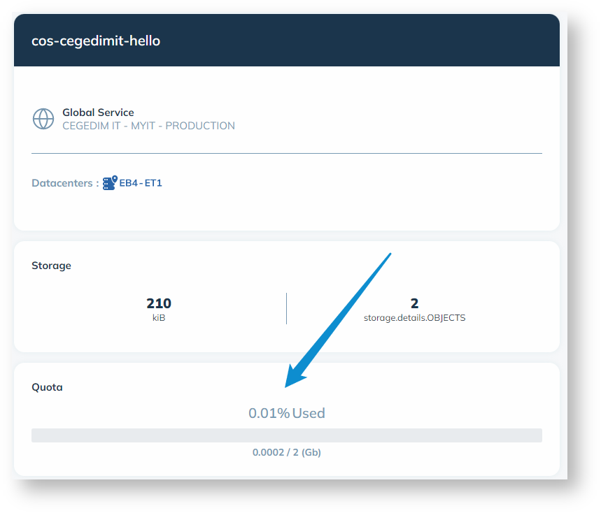 Once Quota applied, on can you follow the status of the Quota on the detailed information page of your **Object Store**: