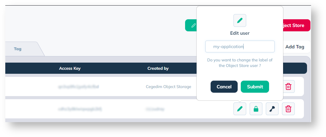 You can at any time change the secret key of an **Object User** by clicking on the ![](https://docs.cegedim.cloud/download/thumbnails/102140875/image2022-11-10_16-0-52.png?version=1\&modificationDate=1668092452569\&api=v2) button.