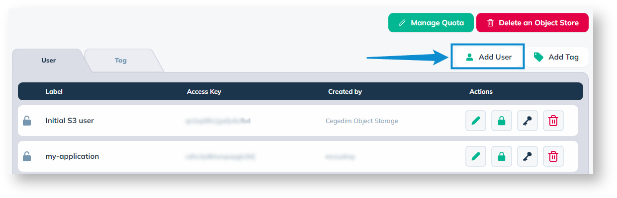 In the detailed page on your **Object Store**, click on the "**Add User**" button