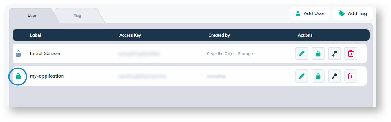 An **Object User** locked have a closed green pad lock ![](https://docs.cegedim.cloud/download/thumbnails/102140875/image2022-11-10_15-59-11.png?version=1\&modificationDate=1668092352015\&api=v2) on the left of the label and can't perform any operation using the **S3 API**.